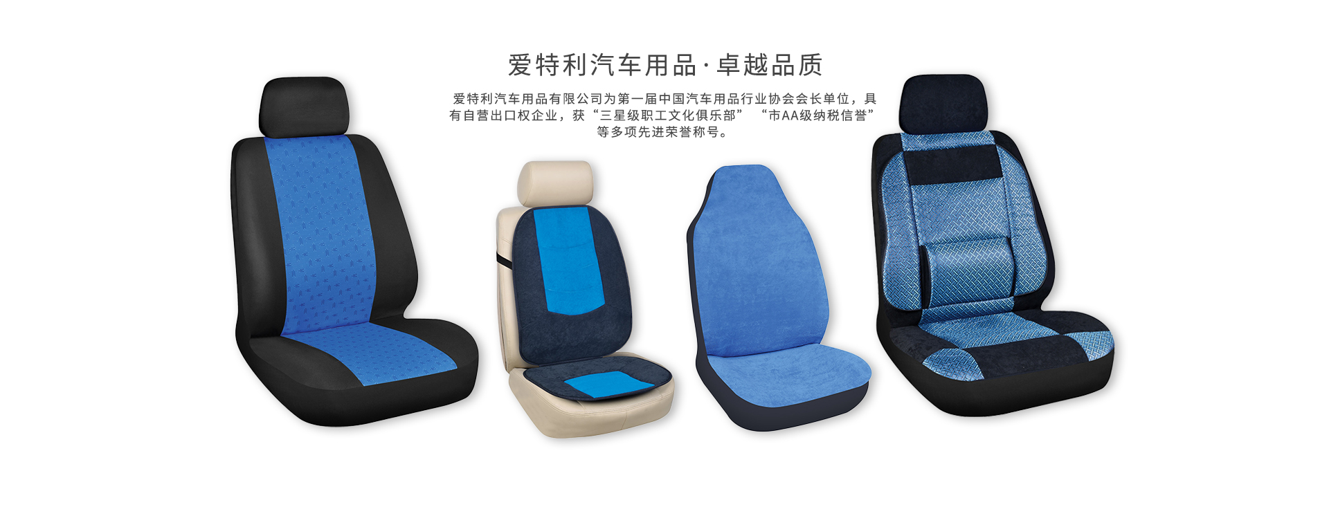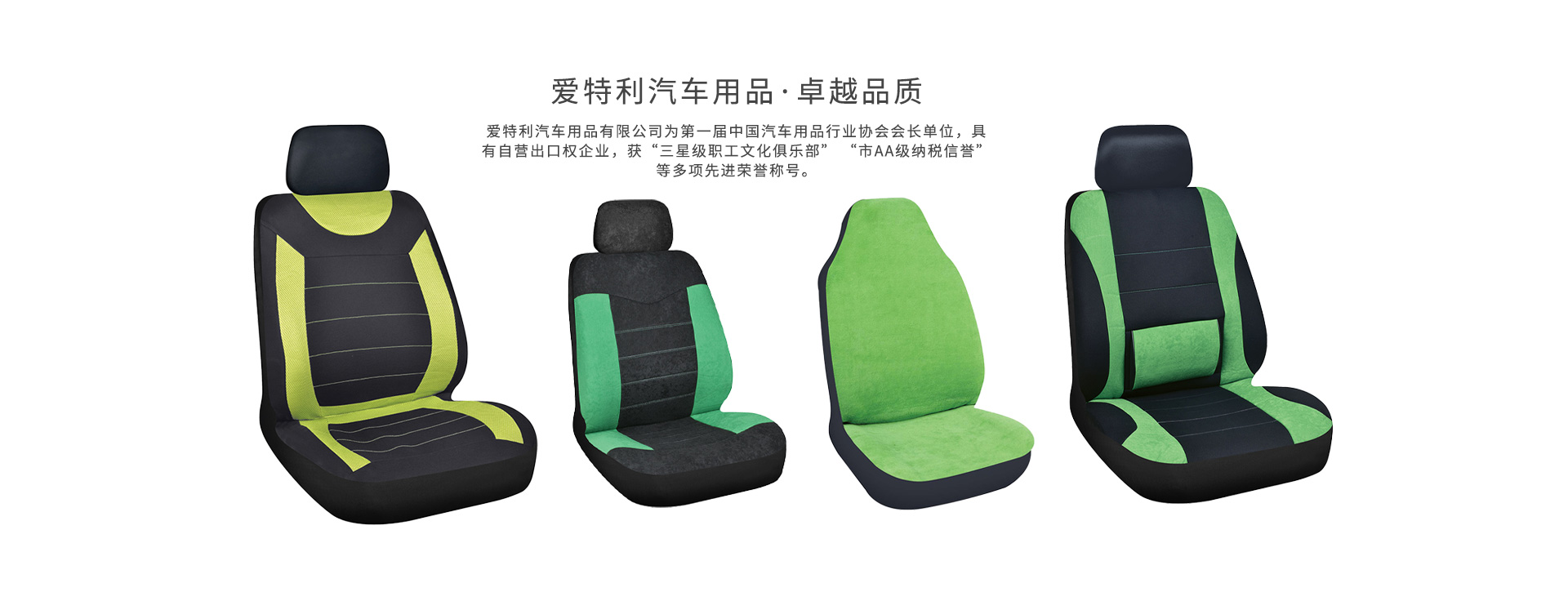 浙江愛(ài)特利汽車(chē)用品有限公司創(chuàng)立于1987年,位于中國(guó)汽車(chē)用品專(zhuān)業(yè)生產(chǎn)基地——天臺(tái)縣坦頭鎮(zhèn)工業(yè)園區(qū)。是一家專(zhuān)業(yè)生產(chǎn)汽車(chē)椅套、座墊、腳墊、方向盤(pán)套、工具包、護(hù)肩套等產(chǎn)品的中外合資企業(yè),為第一屆中國(guó)汽車(chē)用品行業(yè)協(xié)會(huì)會(huì)長(zhǎng)單位,具有自營(yíng)出口權(quán)企業(yè),獲“三星級(jí)職工文化俱樂(lè)部” “市AA級(jí)納稅信譽(yù)”等多項(xiàng)先進(jìn)榮譽(yù)稱(chēng)號(hào)。